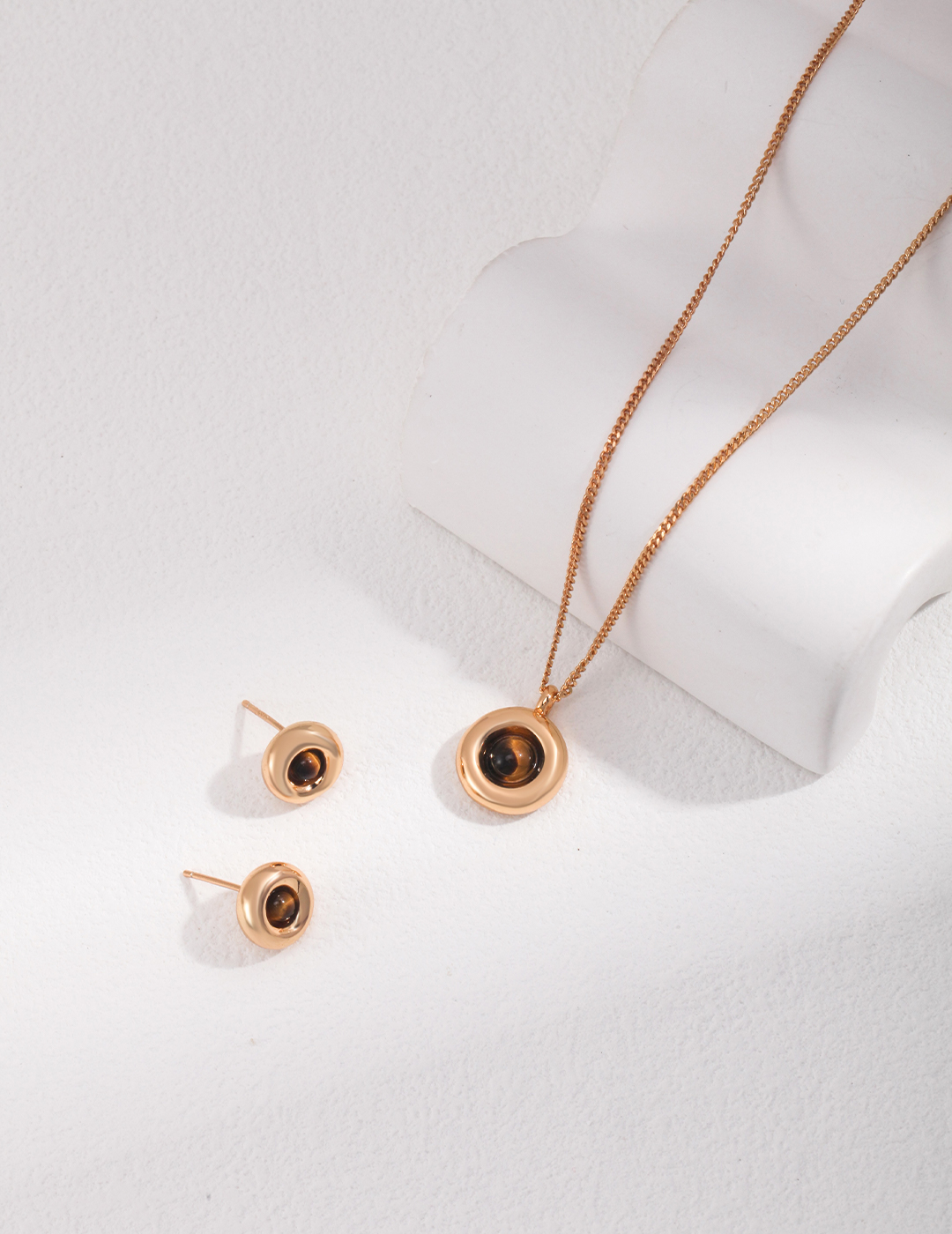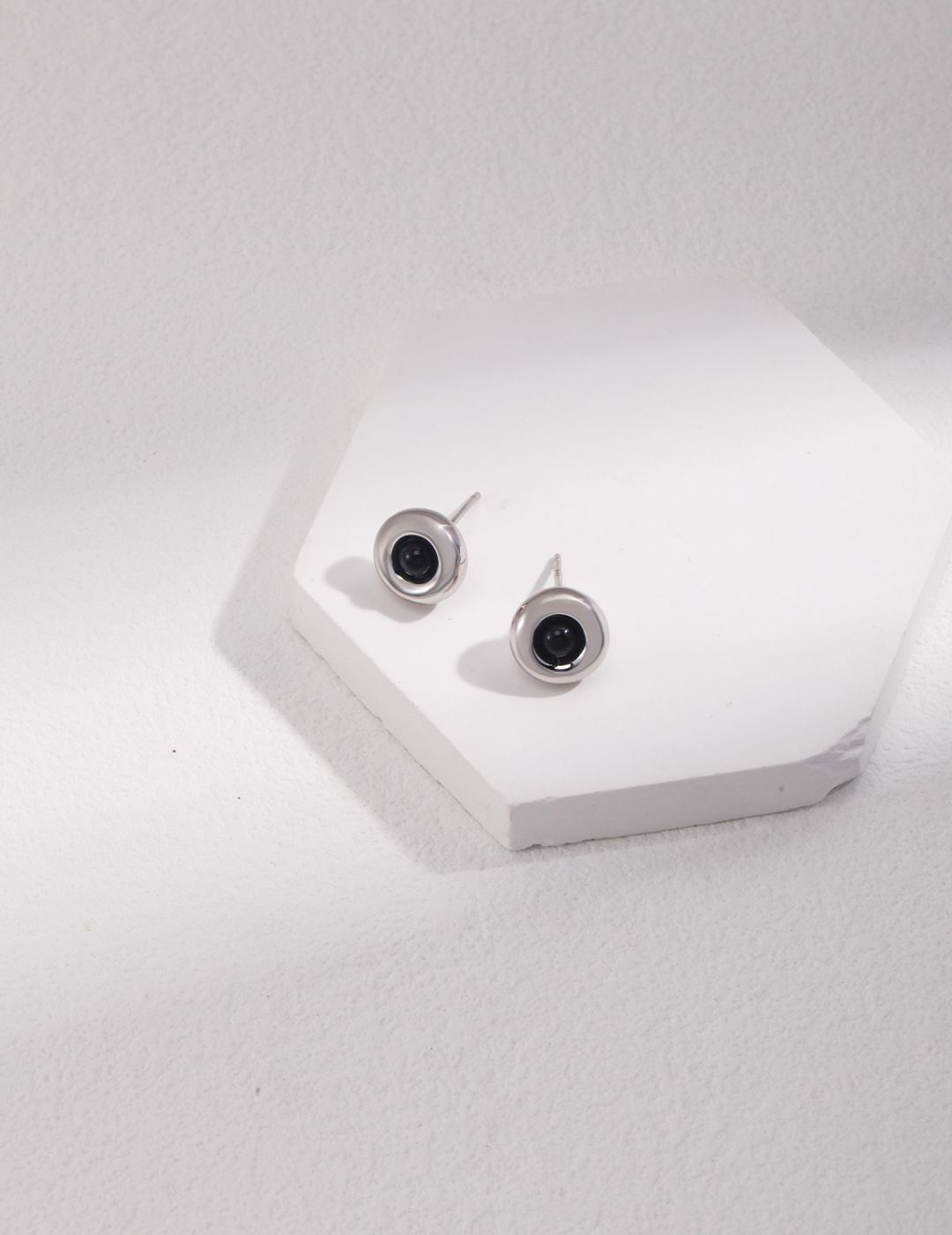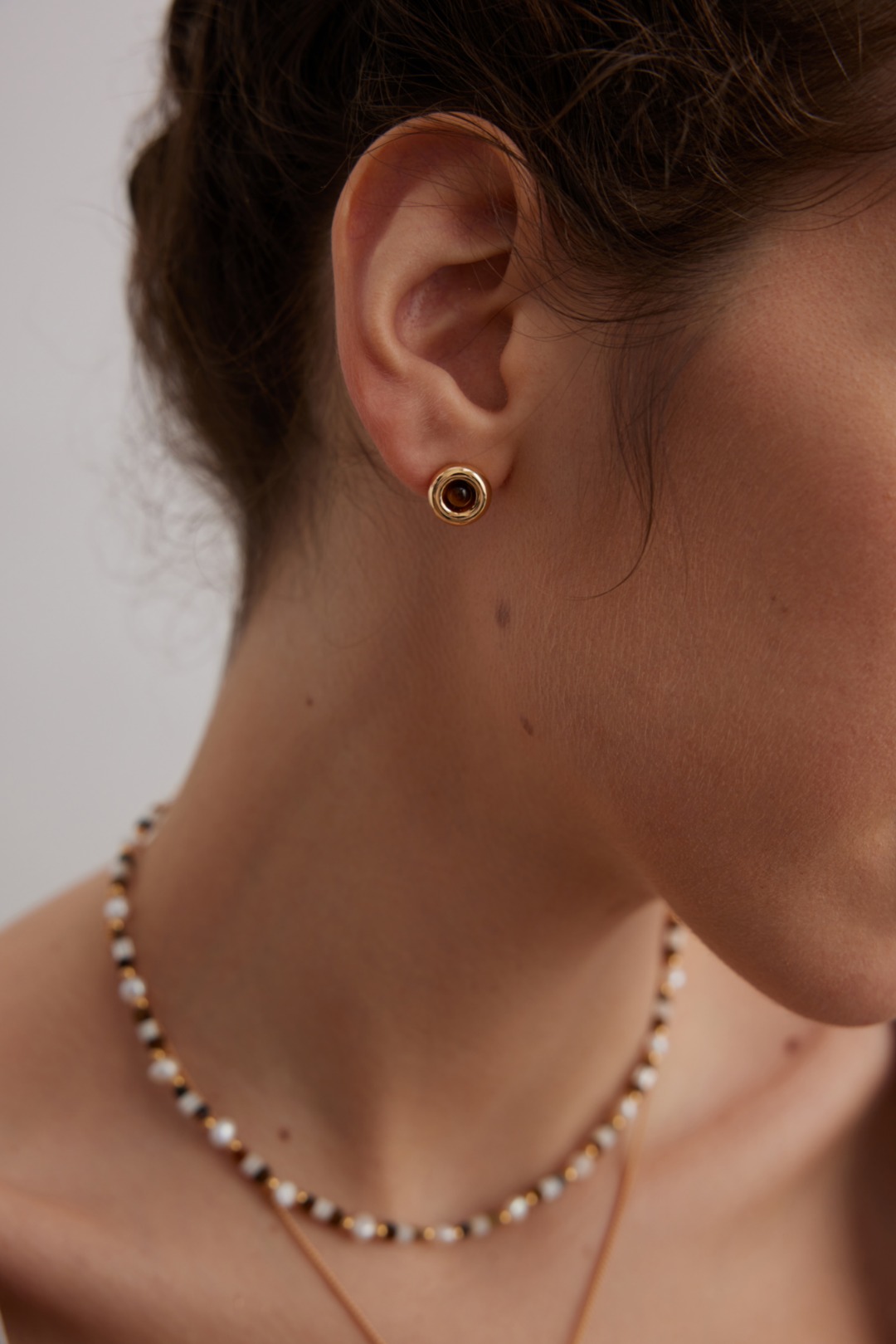 925 Sterling Silver Minimalist Tiger's Eye and Black Agate Natural Stone Round Stud Earrings E01016