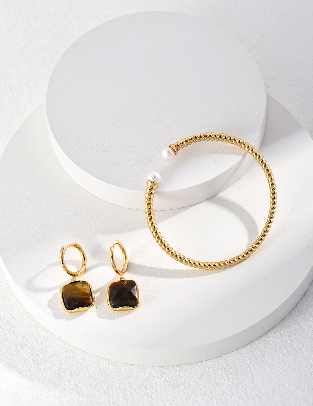 925 sterling Silver Tiger's Eye Natural Stone Square Pendant Earrings E01138-2
