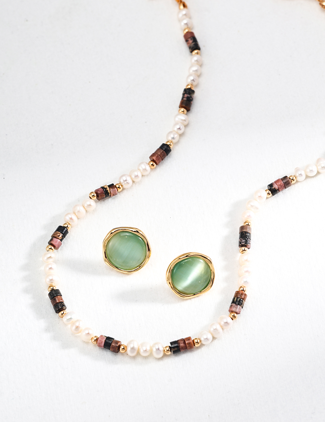 925 Sterling Silver Tiger's Eye Natural Pearl Necklace N0510