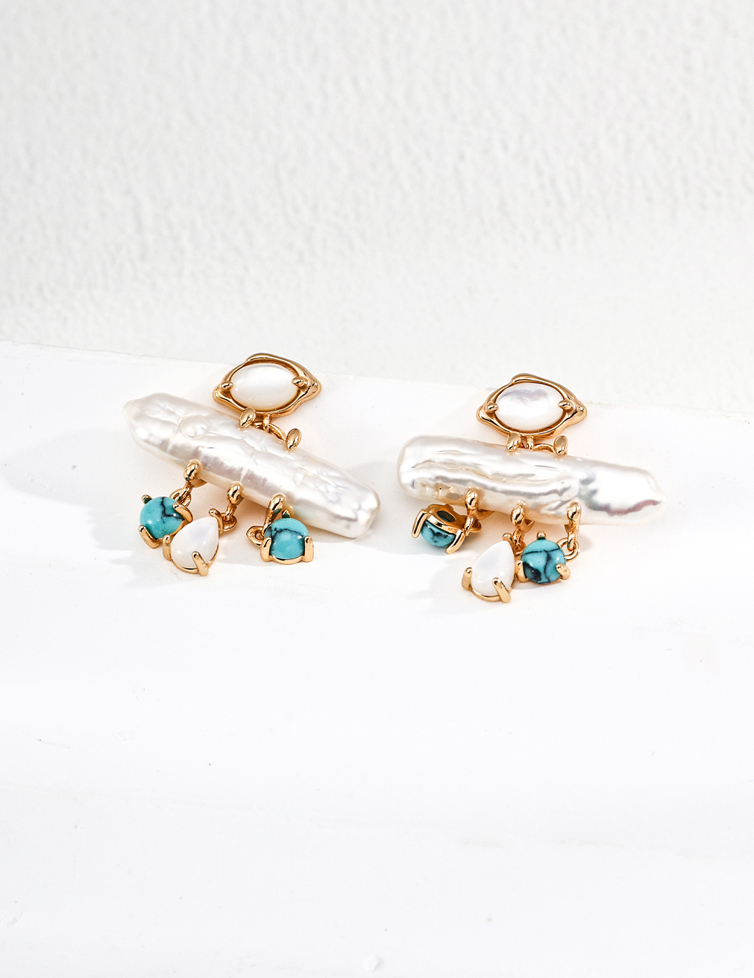 925 Sterling Silver Natural Baroque Bar Pearl White Mother-of-Pearl Blue Turquoise Pendant Earrings E01355-2